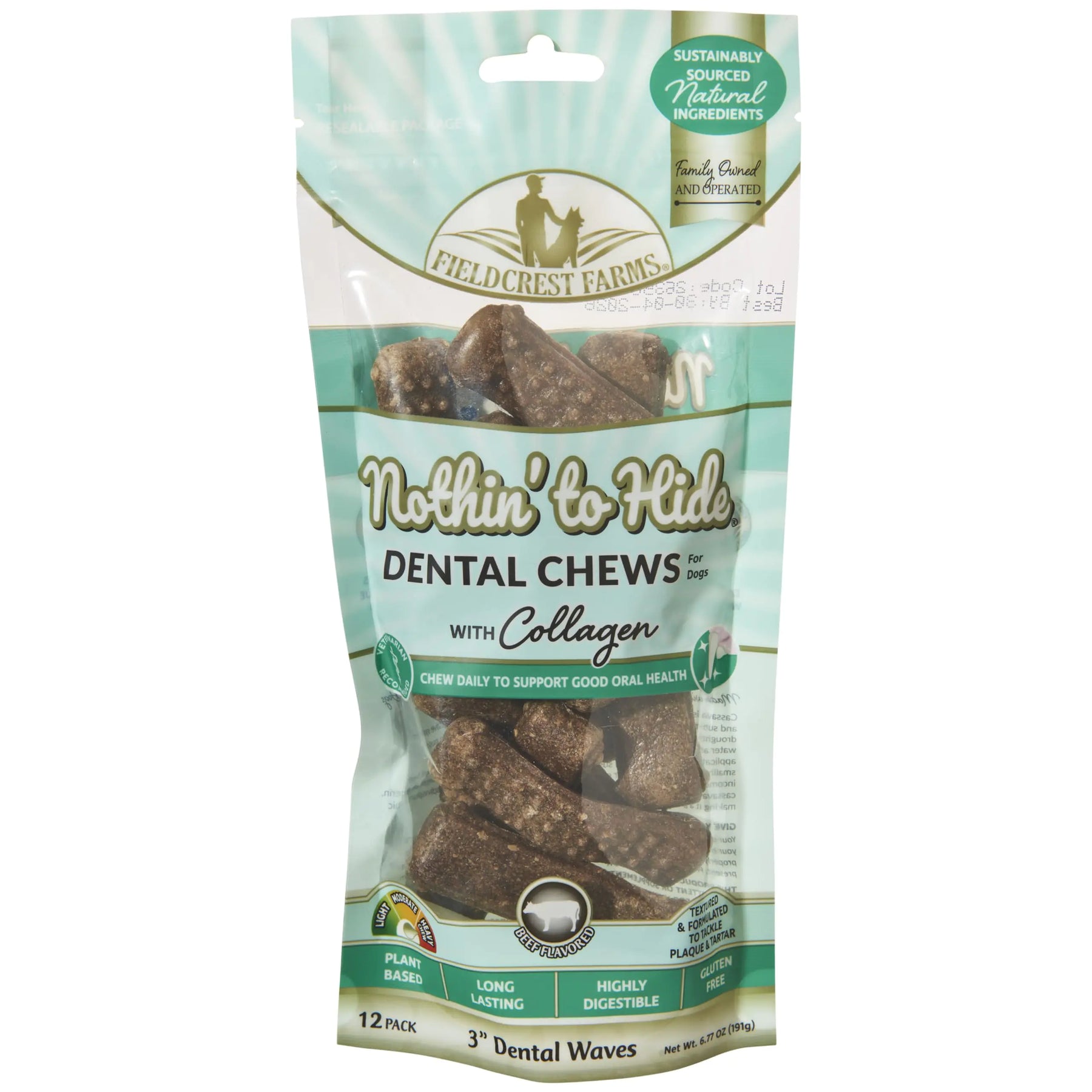 Enhance your dog's dental health with Fieldcrest Farms Dental Chews for Dogs. These 3-inch wave-shaped chews come in a convenient 12-count pack, expertly designed to combat plaque and tartar while promoting overall dental well-being. 🐶