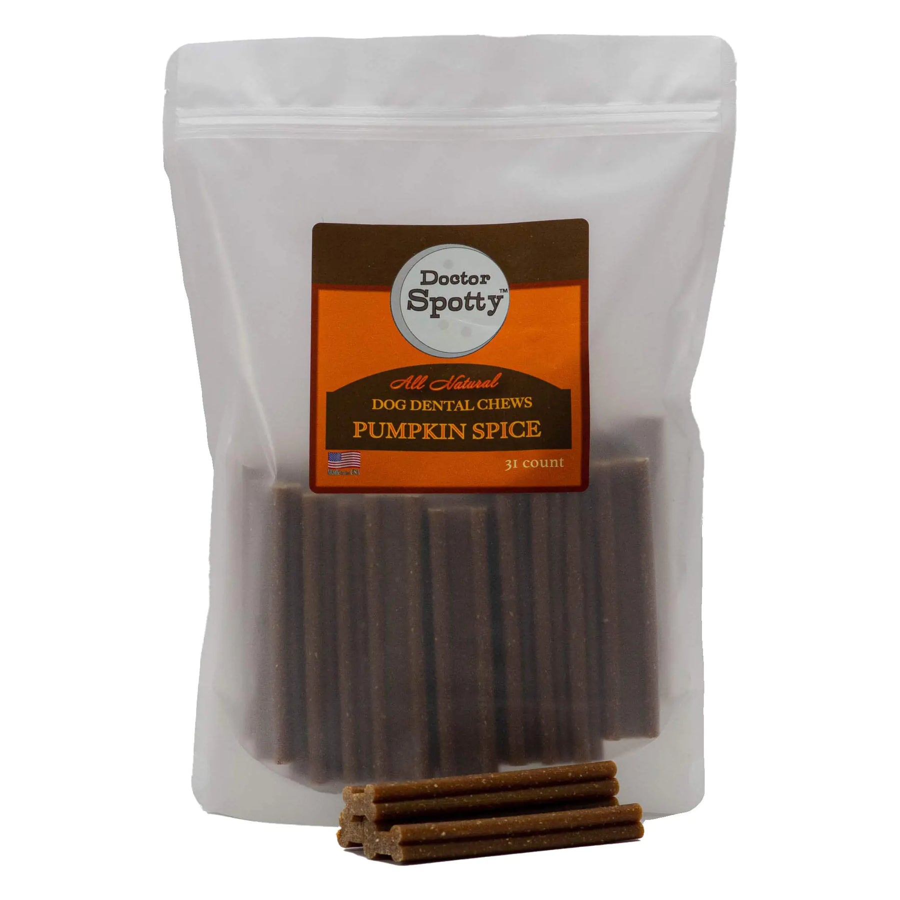 Doctor Spotty Dog Dental Chews Pumpkin Spice: Treat your canine to these premium, all-natural dental chews crafted with love in the USA. No grains, corn, wheat, or soy—only healthy, wholesome ingredients.