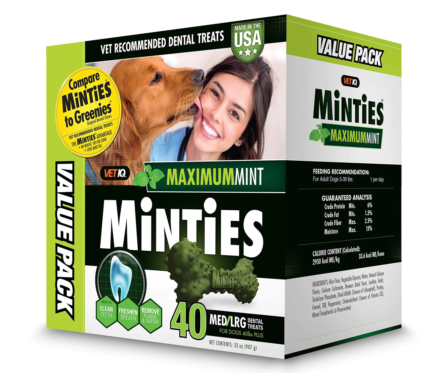VetIQ Minties Dental Bone Treats for Large Dogs deliver an effective solution for your pet's oral health. These treats not only ensure fresher breath but support teeth cleanliness by physically removing plaque and tartar as your dog chews.