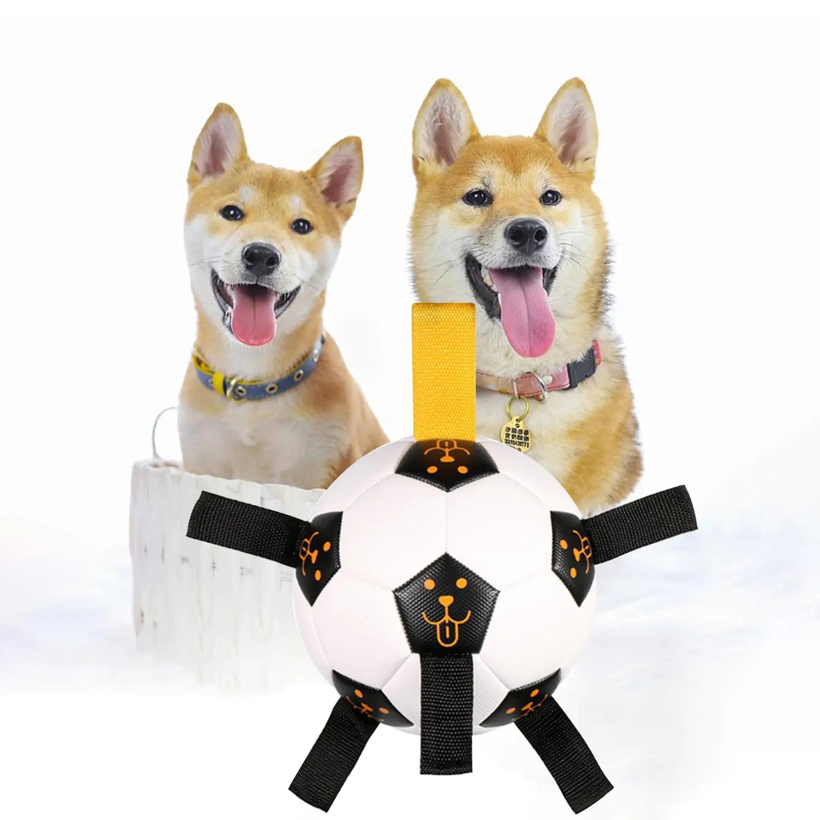 [Durable & Soft Material:Made with premium PU material this dog soccer ball is safe for your pet.And the soccer ball is lined with cotton yarn rubber lining so that it can be kicked and bounces as well. The soft straps are gentle on their teeth and jaws during play. "Interactive Soccer Ball: Designed with 6 evenly sewn nylon straps this interactive toy makes it easier for dogs to fetch toss and retrieve. The long nylon rope allows for fun games of pulling tossing and tug of war.Theres a longer strap for people to hold onto the ball making it a great interactive dog toy to train your dogs." Ultra Bouncing Ball for Water Play: Adopted the lightweight buoyant design our soccer ball for dogs can be played in the pool lake and beach as well. The straps dog soccer ball is meant to keep your dog entertained active and help human beings and dogs stay engaged. "Pump & Needle Adapter Included: The deflated soccer ball comes with a needle point adapter and pump we provide everything you need to get started right away. At 6.7 inches in diameter its suitable for dogs of all sizes and breeds (excluding aggressive chewers)." Perfect Present For Dogs: This soccer ball dog toy provides sensory stimulation and helps fight boredom and mischievous behavior. It also helps reduce anxiety and depression.This is limited to interactive dog not chew toys!!!]
